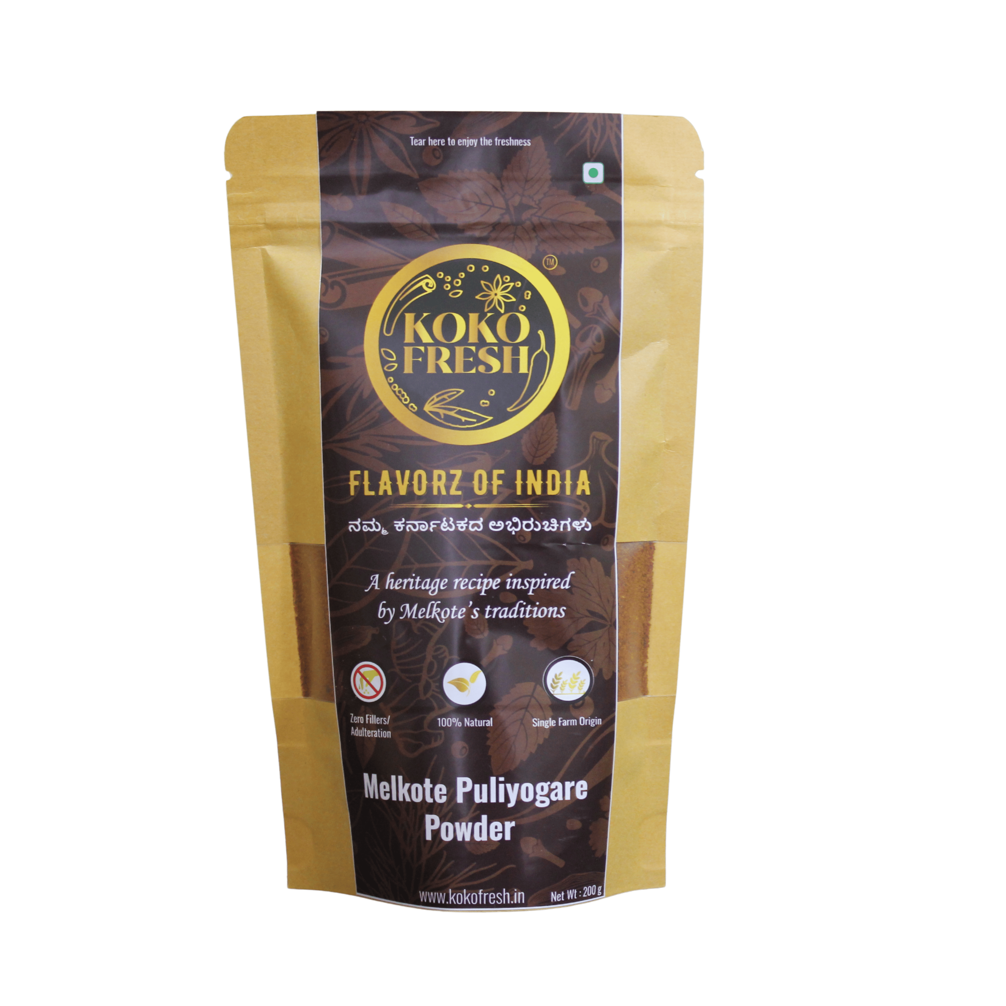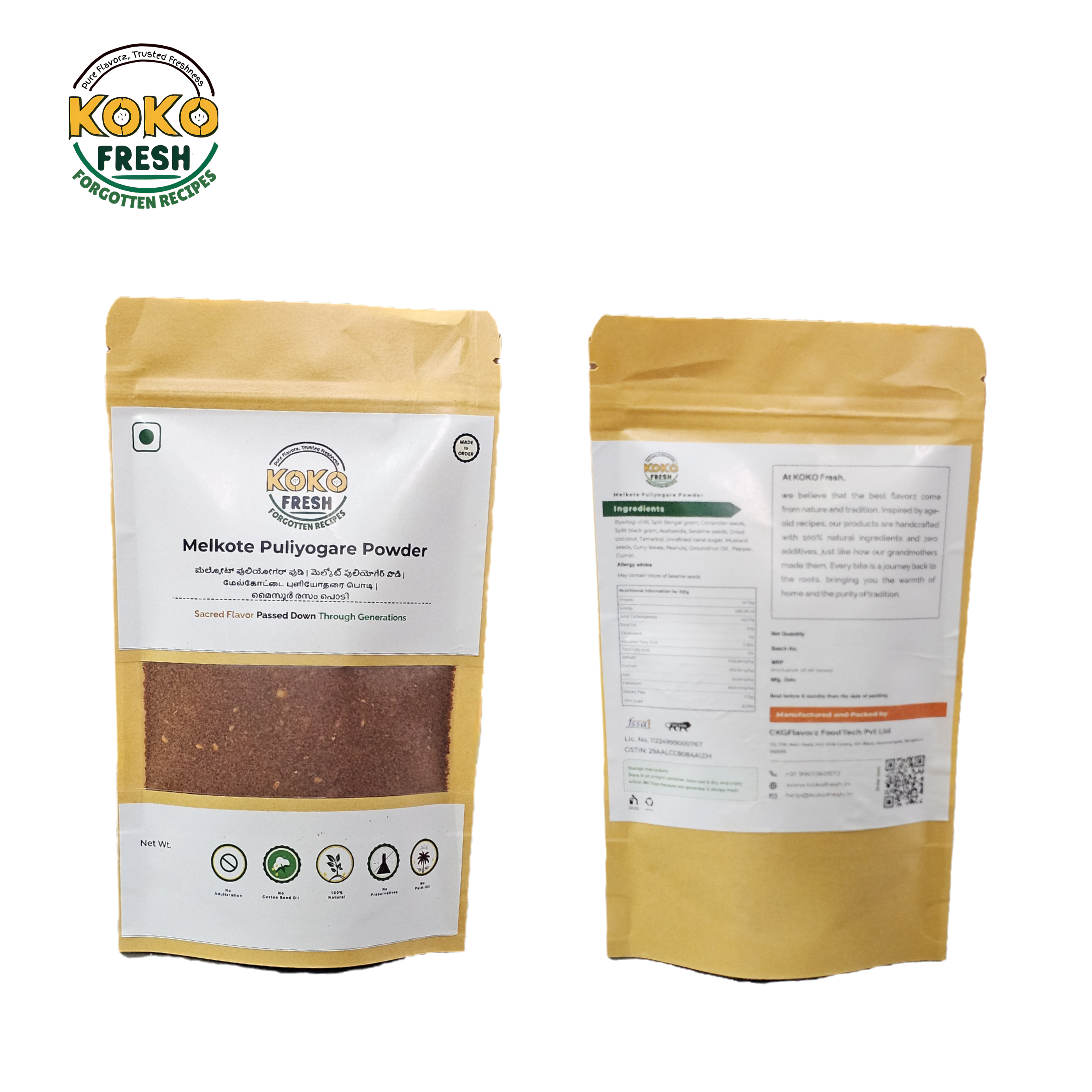 Every ingredient is roasted separately and ground in small batches - never mixed with artificial enhancers. The blend contains only traditional ingredients used in Melkote-style puliyogare.