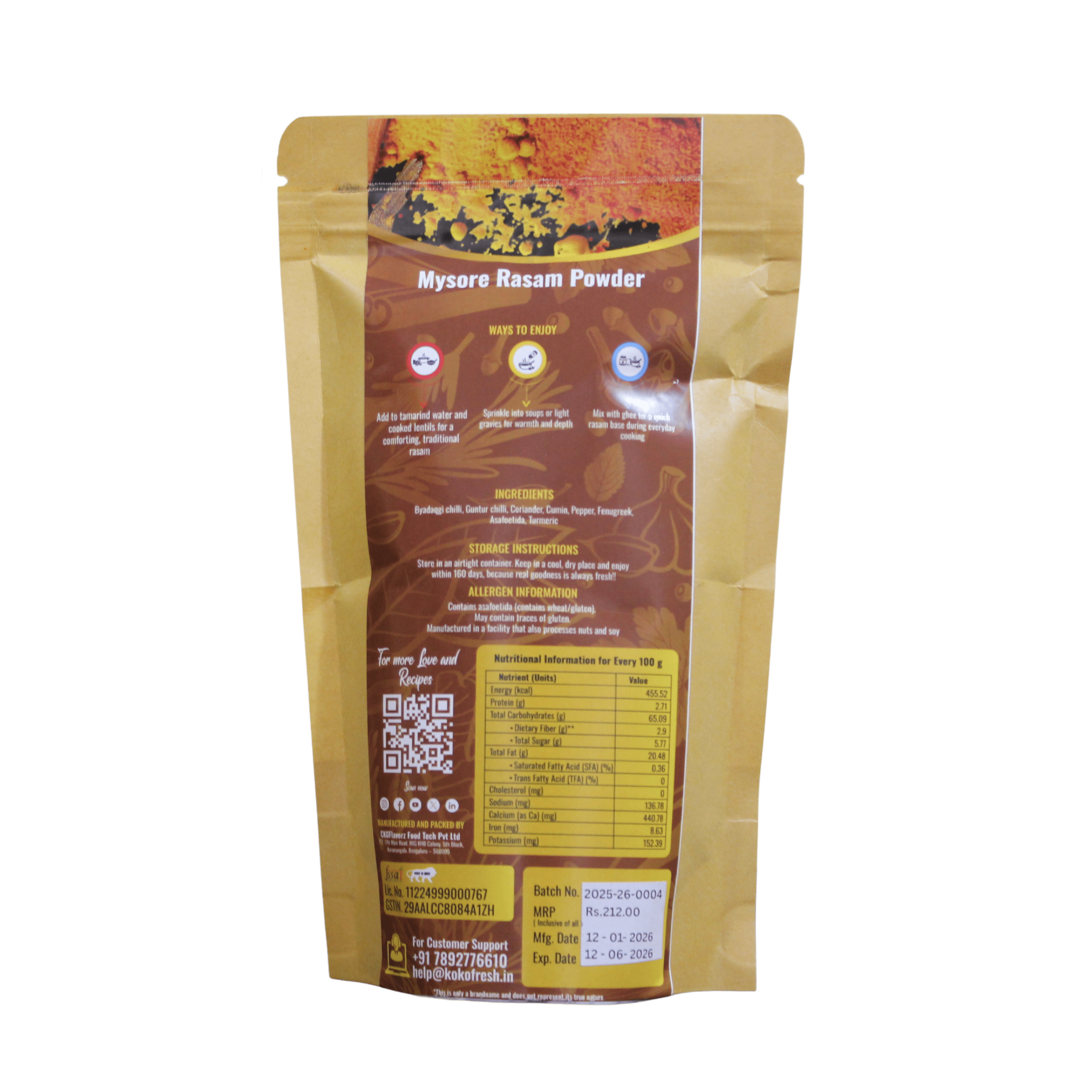 Rasam powder contains freshly roasted spices that naturally release aromatic oils. Since we do not add preservatives or anti-caking agents, the aroma gradually reduces over time. After 180 days, it remains safe to consume, but the fragrance and flavour may begin to fade - a sign of preservative-free rasam powder.