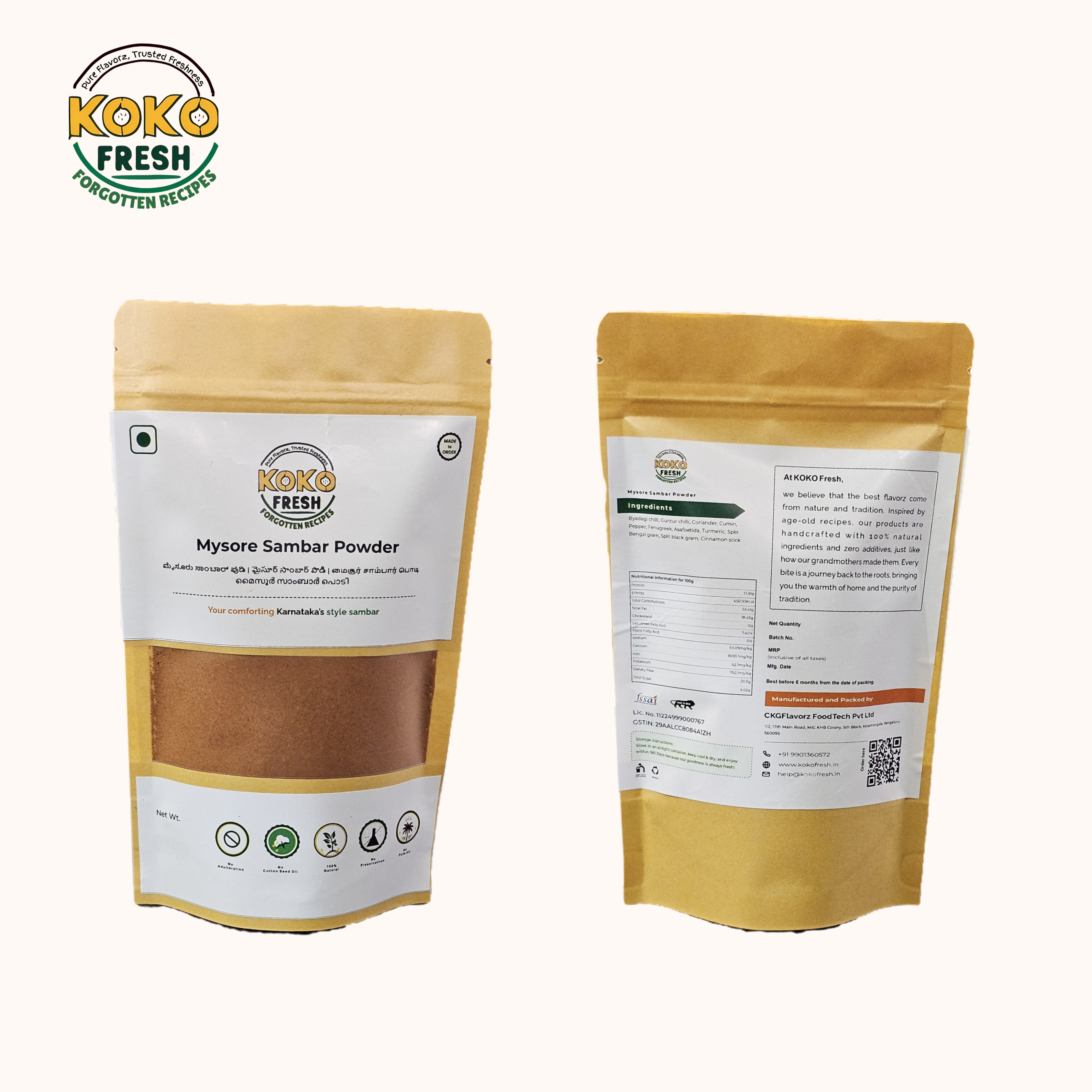 Traditional sambar powder contains roasted spices and lentils that naturally release aromatic oils. Since we do not add preservatives, anti-caking agents, or artificial stabilizers, the aroma and flavour gradually reduce over time. After 180 days, it remains safe to consume, but the freshness and intensity may begin to fade — a hallmark of preservative-free sambar powder.