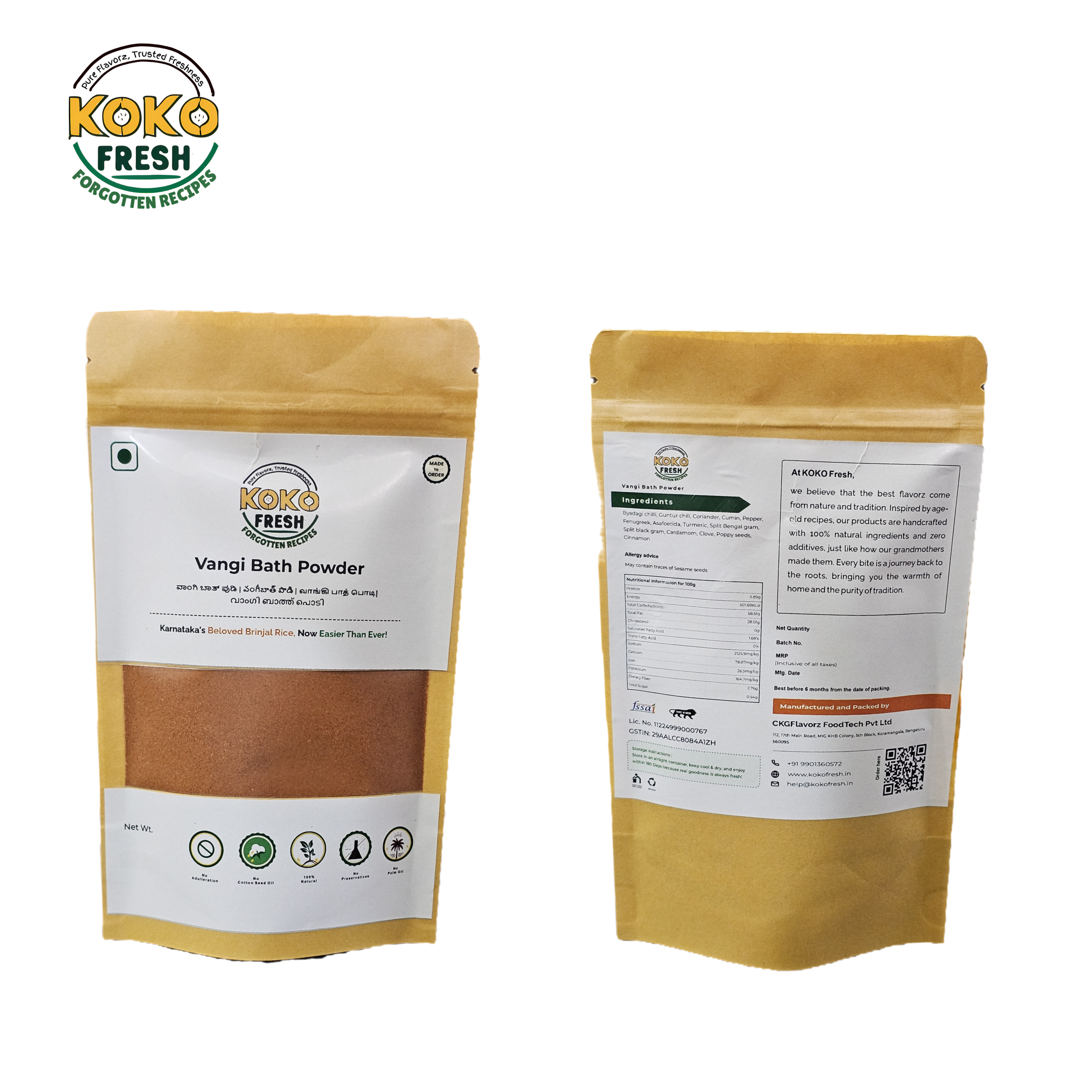This masala contains roasted lentils, poppy seeds, and whole spices that naturally release aromatic oils. Since we do not add preservatives or stabilisers, these oils slowly lose intensity over time. After 180 days, it remains safe to consume, but the aroma and flavour richness may gradually reduce - a sign of natural, preservative-free vangibath masala.