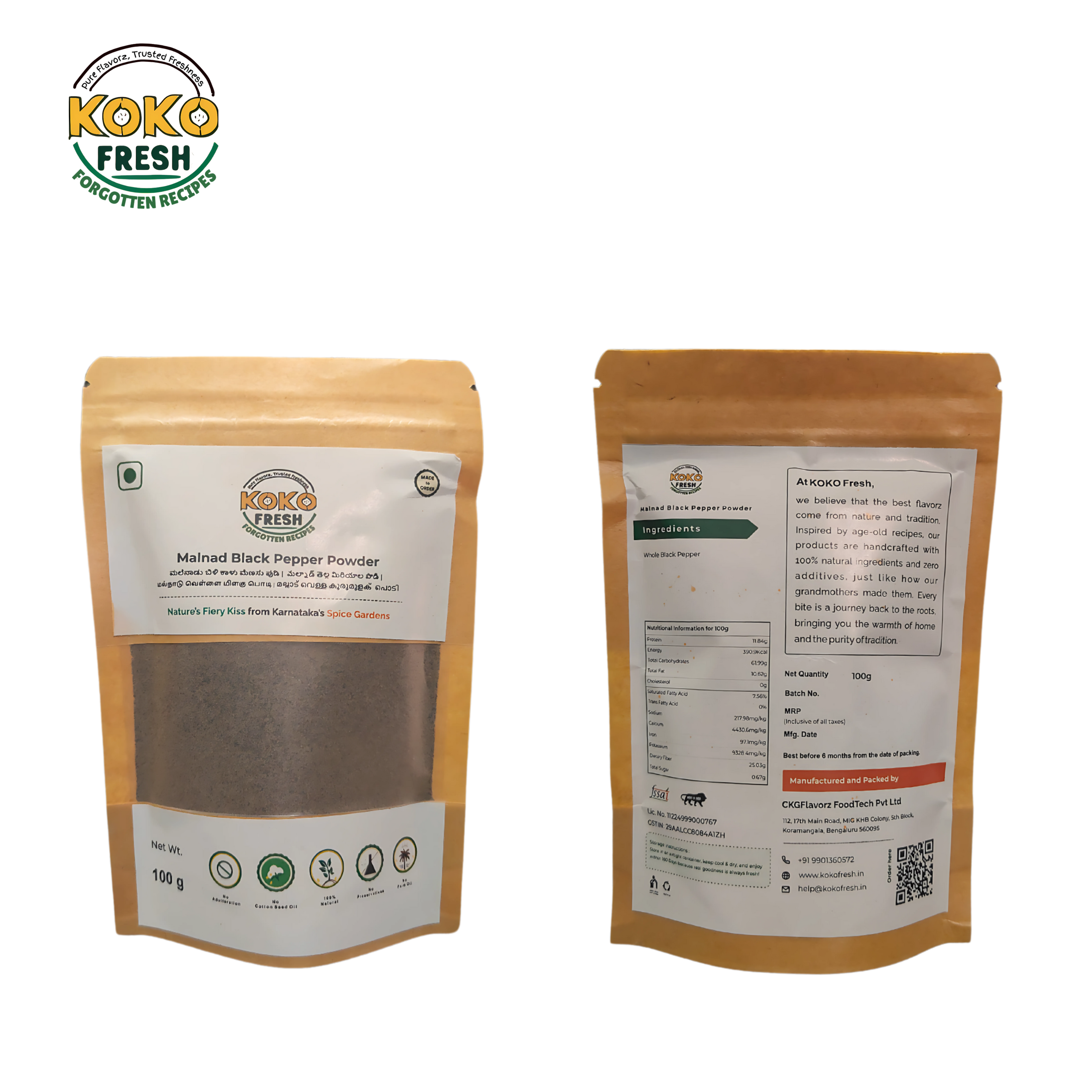 Sourced from the rain-soaked hills of Malnad, our handpicked peppercorns are sun-cured and freshly ground to preserve their bold aroma and rich warmth.