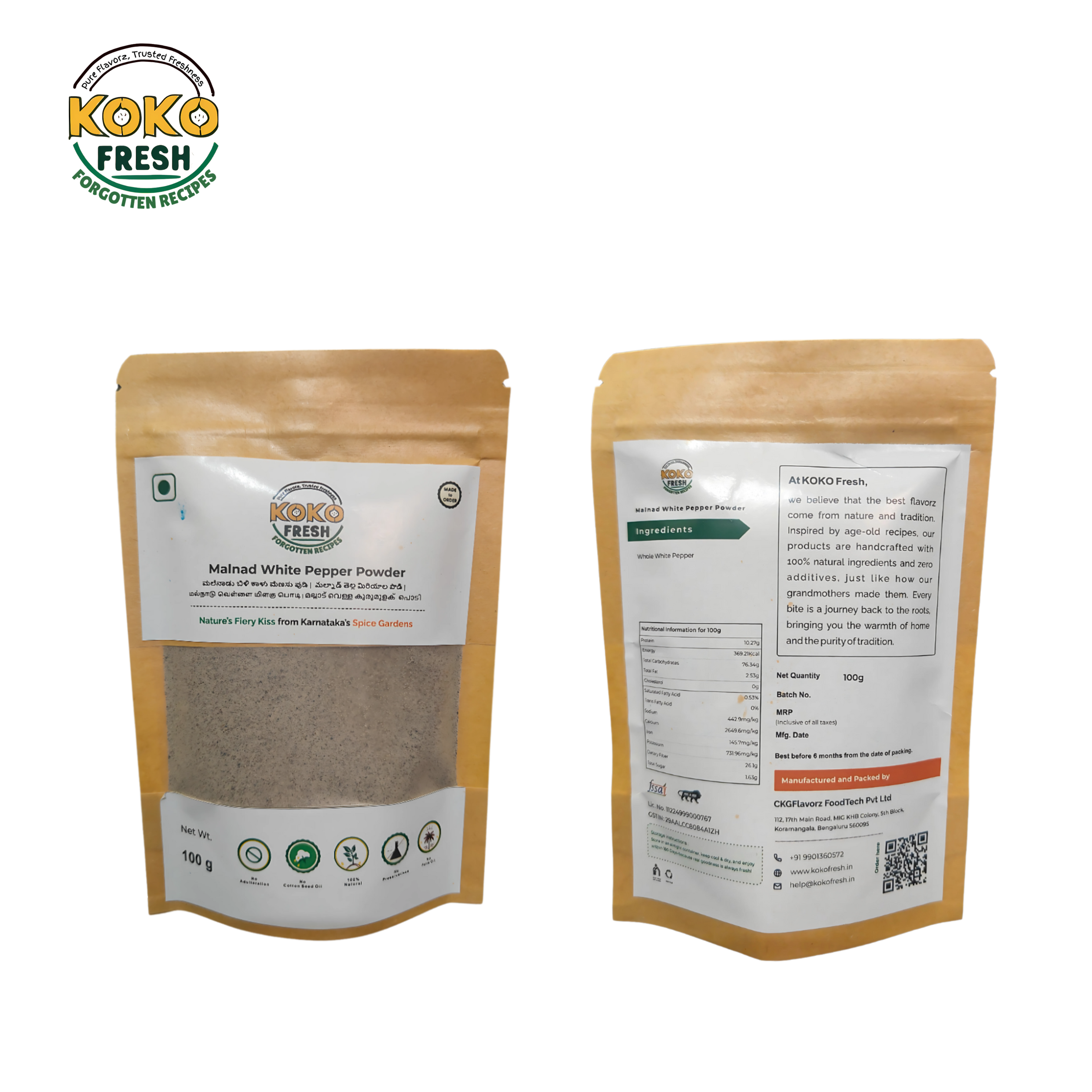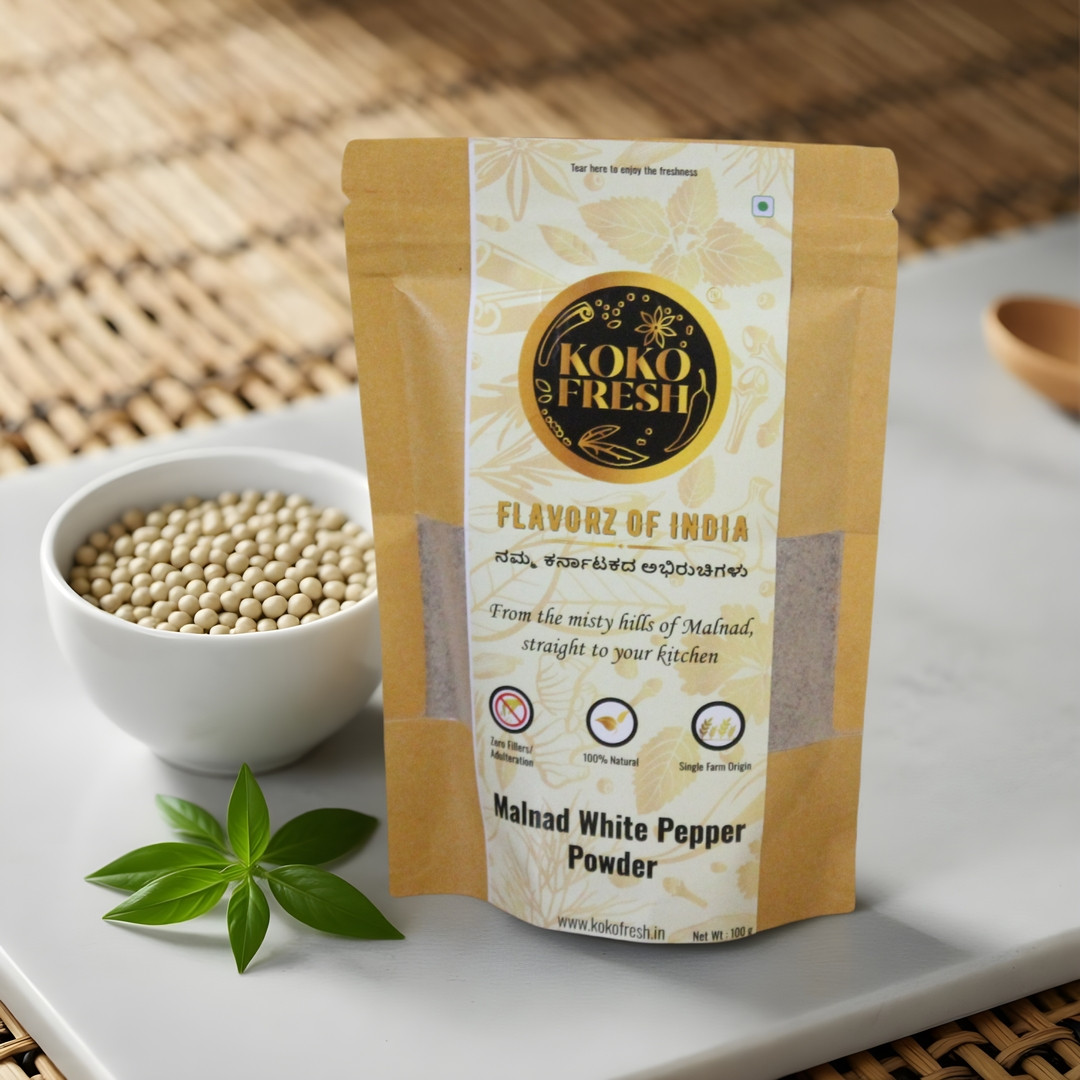 Sourced from the misty hills of Malnad, this hand-skimmed white pepper offers a gentle warmth and smooth, refined flavor.